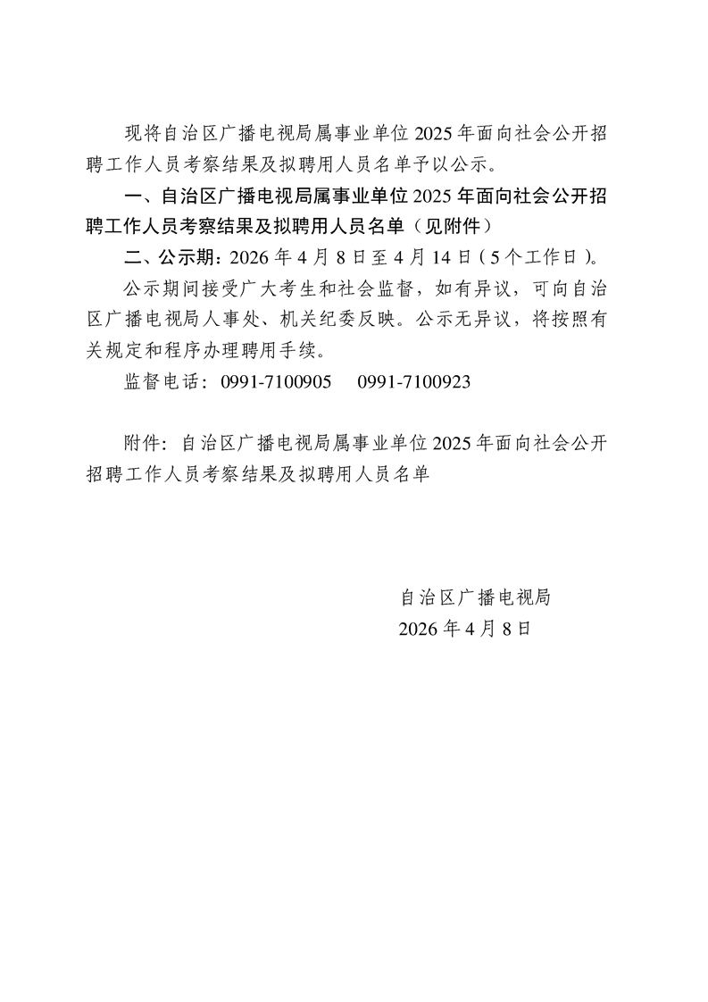 自治区广播电视局属事业单位2025年面向社会公开招聘工作人员考察结果及拟聘用人员公示